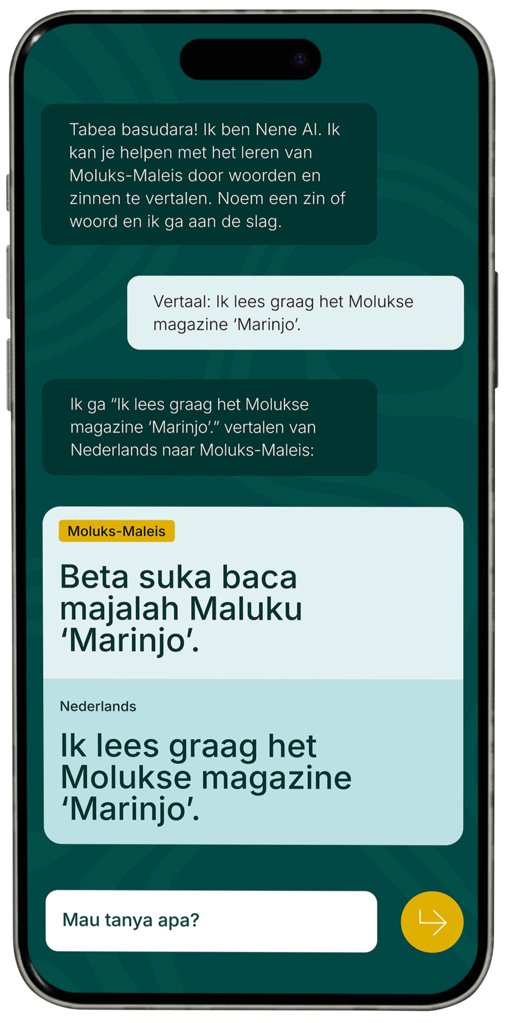 Moluks erfgoed verdient respect. Daarom bouwen we Nene AI alleen met data waarvoor toestemming is gegeven. En werken we samen met gemeenschappen op Maluku en in Nederland om de taal zorgvuldig vast te leggen. Dit is geen initiatief van één persoon. Dit is iets wat we samen doen.